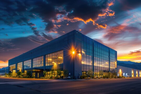 Building At Night. Large warehouse gym exterior with dramatic night sky