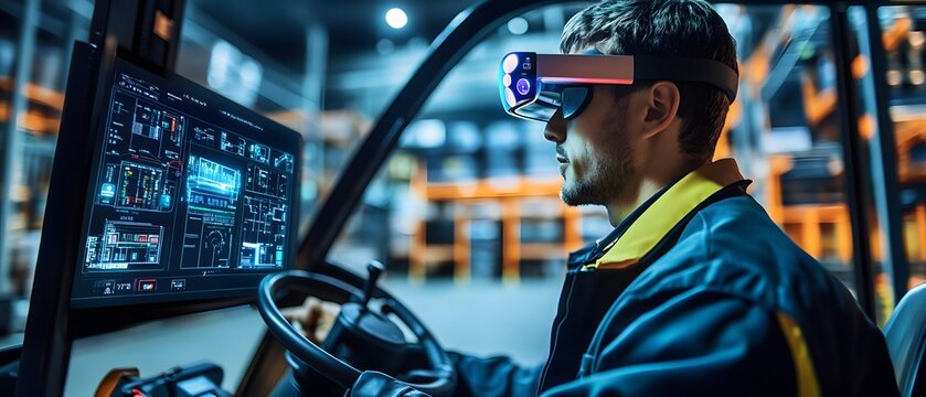 A warehouse operator uses augmented reality glasses to navigate and control a forklift with advanced technology.