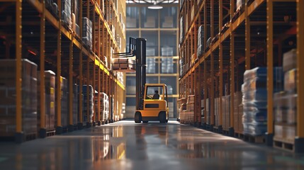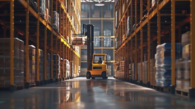 Forklift placing pallets on high shelves, in a large warehouse, detailed and lifelike