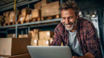 Small business owner managing online order from home inventory warehouse with smile while using laptop for ecommerce fulfillment and shipping process