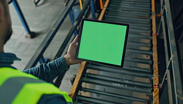 Worker using green screen tablet in factory; conveyor belt background; inventory management