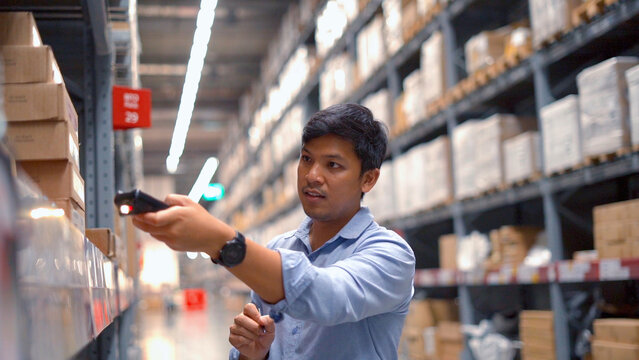 Warehouse workers  scanning barcodes on boxes in a large warehouse