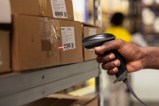 Close up of black worker scanning the barcode awb tags on cargo boxes, registering the merchandise and shipment details before distribution. Using scanner on tracking numbers in depot.