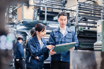 タブレットを見ながら工場で議論をするスタッフ
