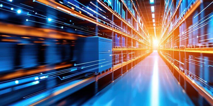 A high-tech warehouse scene with illuminated shelves, showcasing motion and energy, emphasizing efficiency in logistics and storage.