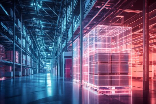 Futuristic smart warehouse with interactive digital overlays for efficient storage management. Concept Warehouse Automation, Digital Technology, Inventory Management, Smart Logistics