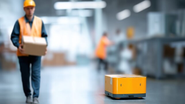 Warehouse robot carrying box approaches human worker in busy industrial setting, showcasing automation and teamwork