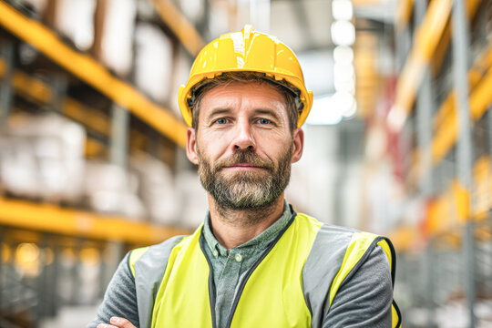 A confident man in a yellow helmet and safety vest stands in a warehouse, surrounded by shelves filled with goods.