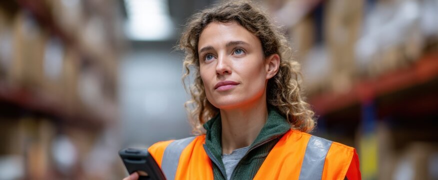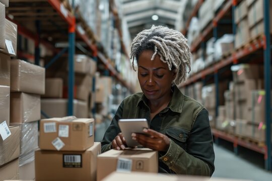 Mature woman scanning inventory in warehouse aisle using tablet and ar overlay
