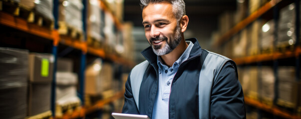 Smiling male warehouse manager using a digital tablet for inventory management in a modern storage facility, exemplifying efficient logistics and organization