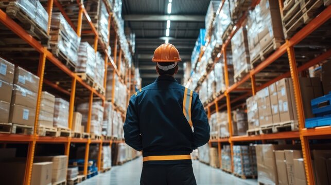 Warehouse worker using digital tablet to manage inventory in large distribution center. Logistics management, supply chain, inventory tracking, automation, warehouse operations, stock control.