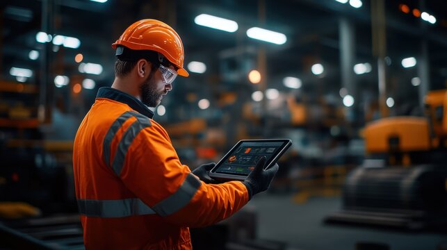 Engineer Using Tablet in Industrial Warehouse Setting