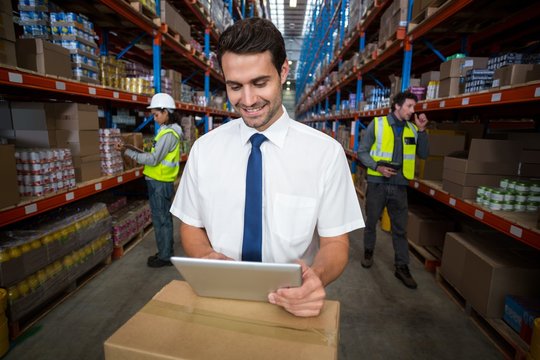 Warehouse manager using tablet for inventory control, navy shirt and eyeglasses