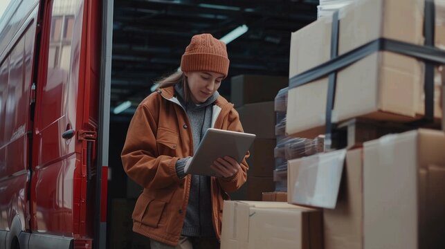 Female manager using tablet computer overseeing worker loading cardboard boxes into delivery truck in busy logistics retail warehouse - efficient online purchase fulfillment and supply chain managemen