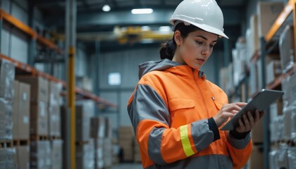 Woman in protective hard hat, orange jacket uses tablet inside warehouse. Rows of storage pallets, overhead crane system visible. Inspects inventory, manages logistics, oversees operations with