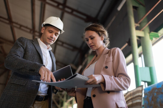 Man and Woman in Warehouse Looking at Tablet Generative AI