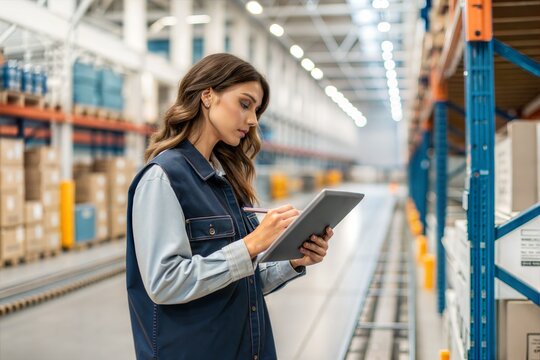 Thoughtful woman using a tablet for warehouse inspection, managing inventory, and monitoring stock levels. Engaged in logistics, maintenance, and supply chain operations in a factory setting. (People)