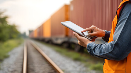 the hand of a warehouse worker operates a tablet, managing a digital construction system with a dashboard, against the backdrop of storage shelves in a bustling commercial warehouse.