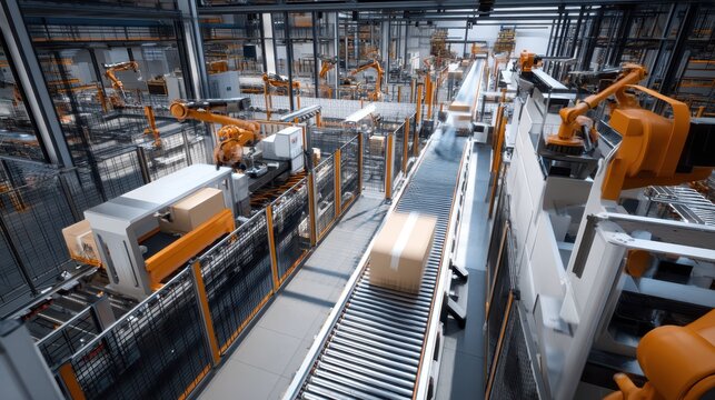 Inside View of a Modern Factory Featuring Conveyor and Robotic Arms
