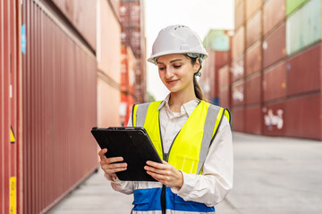 Female factory worker using digital tablet in industrial warehouse, monitoring production and inventory management. Concept of manufacturing process, smart factory, technology, efficiency