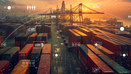 Futuristic port with container stacks, orange sunset, and digital interface elements, logistics efficiency.
