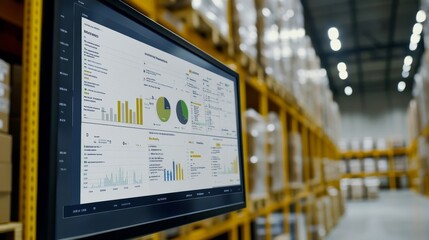 Smart warehouse control room overlooking operations modern urban setting digital interface display high-tech environment futuristic viewpoint for enhanced management efficiency
