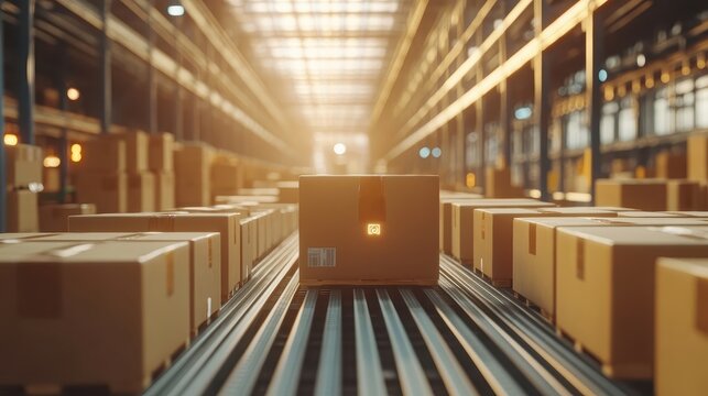 A modern warehouse filled with boxes and digital overlays for inventory management.
