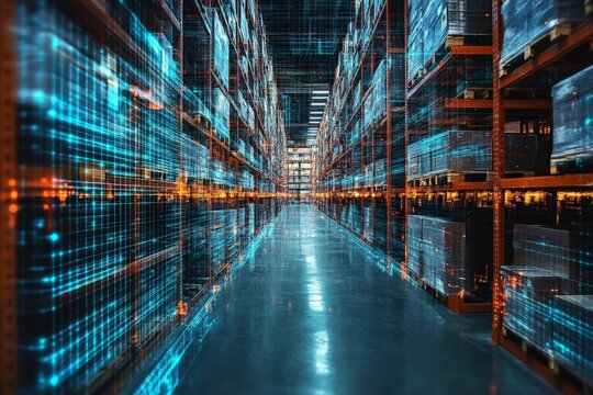 Modern warehouse with advanced technology and digital overlays showcasing logistics and inventory management
