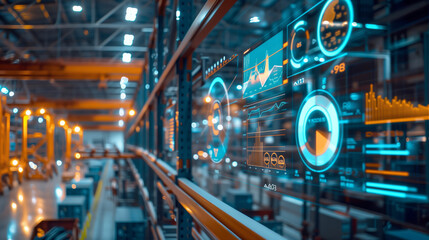 A futuristic warehouse with holographic displays showcasing real-time data and analytics, demonstrating the integration of technology in industrial history
