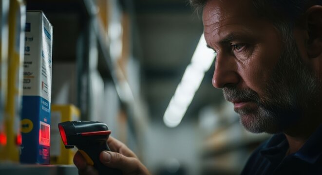 Mature caucsian man scanning product box barcode with handheld scanner in warehouse or retail stockroom. Inventory management.