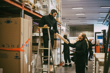 Male and female coworker holding package at logistics warehouse