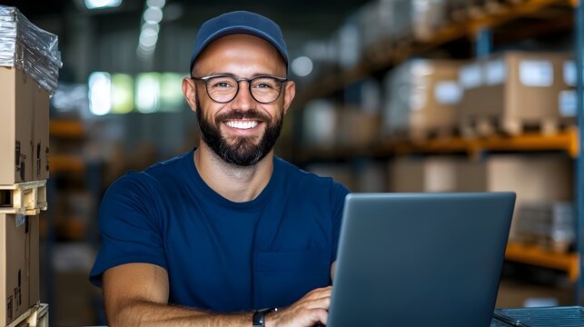 The focused man working on a laptop in a modern warehouse environment.