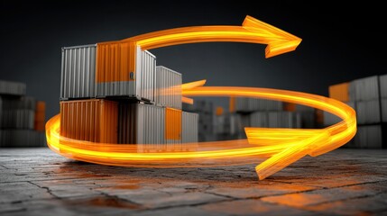 Dynamic Logistics Concept with Shipping Containers and Flowing Arrows Illustrating Supply Chain Movement and Efficiency in a Modern Warehouse Environment