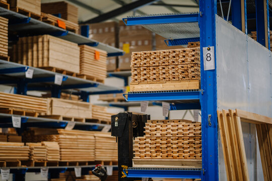 close-up of organized storage in a warehouse setting, featuring neatly stacked wooden planks and materials on blue metal shelving units