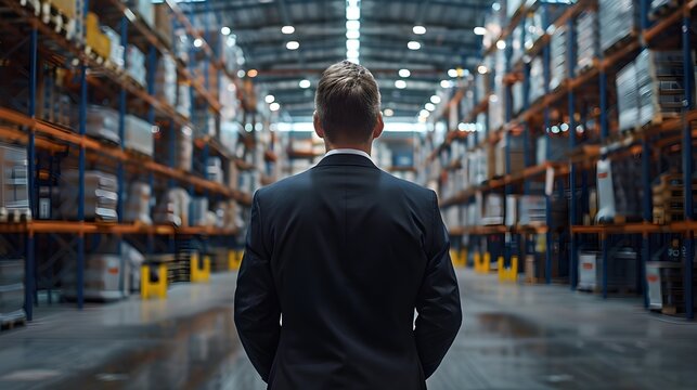Formal Clad Manager Overseeing Warehouse with Strategic Precision