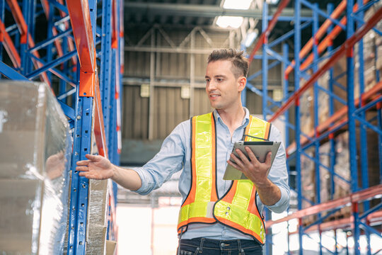 Smart smiling caucasian warehouse man,worker,manager use digital tablet to check goods on shelf for product distribution stock management, Logistics shipping business planning concept with copy space