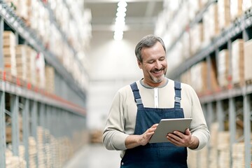 A warehouse worker uses a tablet to manage inventory in a large distribution center, showcasing modern technology in warehouse logistics