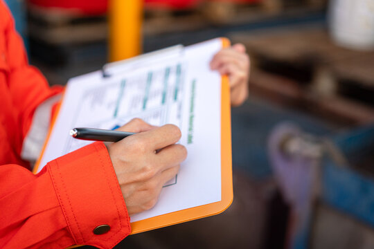 Engineer  wearing safety helmet and vest holding clipboard and take note on the paper in the automotive part warehouse.Products and corrugated cardboard.
