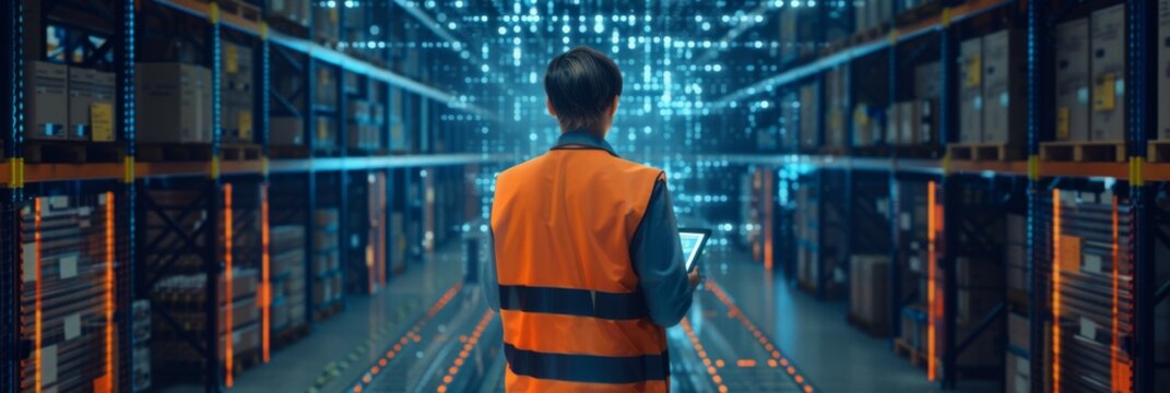 Warehouse worker analyzing data visualization in storage hub