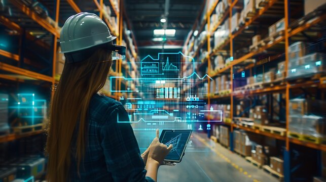 Warehouse Worker Analyzing Data With Augmented Reality Images
