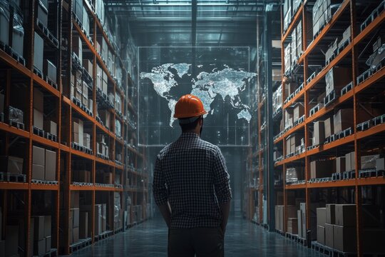 Warehouse worker examines holographic world map showcasing global logistics and connections