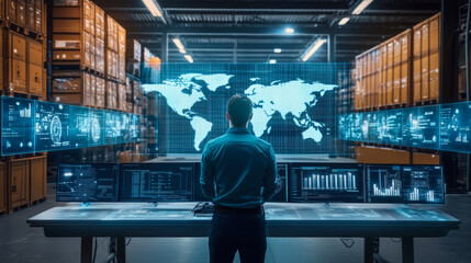 Logistics Manager Monitoring Global Supply Chain on Holographic Screen with 3D Data Visualization