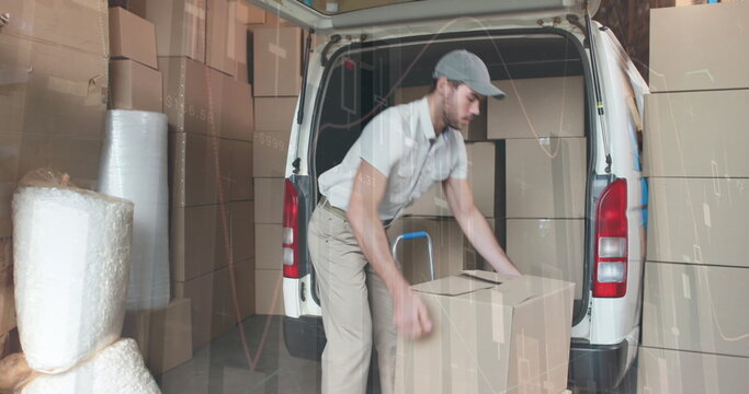 Image of financial data processing over delivery man loading up car outside of warehouse