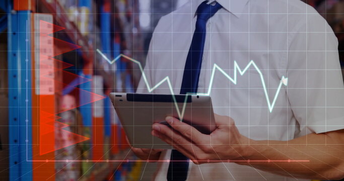Image of financial data processing and caucasian male worker using tablet in warehouse