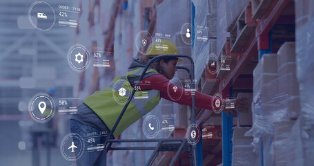 Image of icons and digital data processing over biracial woman working in warehouse