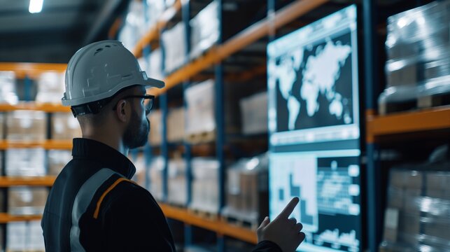 Warehouse worker analyzes inventory data using futuristic touch screen interface for efficient supply chain management