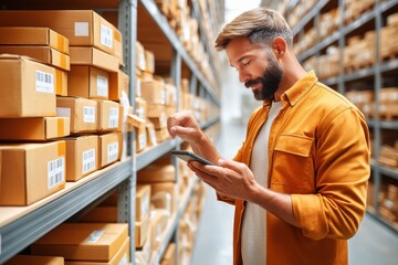 A warehouse worker holds a tablet while managing inventory. The setting showcases organized boxes, highlighting efficiency and technology in logistics.