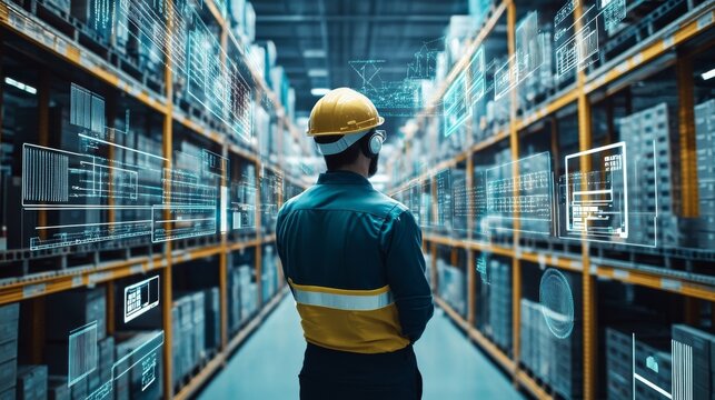 Warehouse Worker Immersed in Holographic Data, Warehouse, Industry 4.0, Augmented Reality