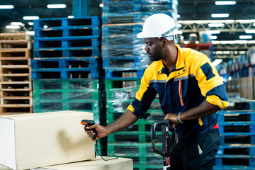 African male warehouse worker wearing safety helmet and uniform scanning barcode on cardboard  using handheld scanner logistics task inventory control shipping supply management industrial warehouse