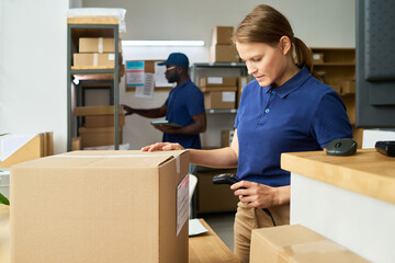Warehouse worker scanning barcode on cardboard box using scanner device